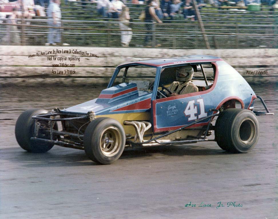 | Comments: | Comment: Interesting sportsman racer, with what looks like a knock off hub on the left front, and an enclosed engine compartment. Car has kind of a lightweight look to it.... It says "Mickey" on the roof, so I'm wondering if this is Mickey Long, who drove a #41 back in the 70's. The car also has Gary's Welding (Edison NJ) which I think was Gary Kolenz who drove a #19 sedan in the 70's, and later owned sprint cars. I'm wondering if that might be Gary behind the wheel, and also if there was some sprint car ideas built into this little Gremlin. |