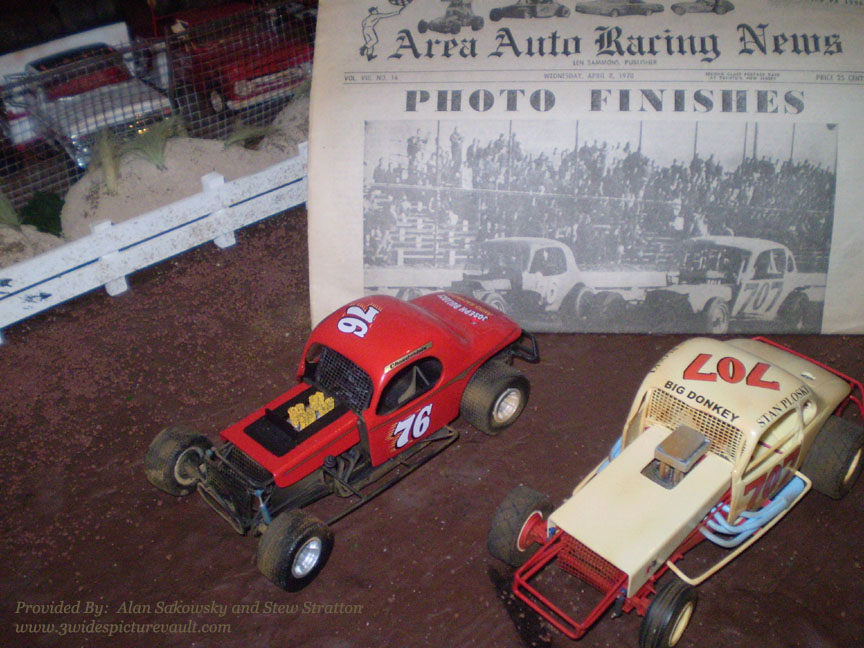 I wanted to do a diorama that was representative of a typical field that might have raced at East Windsor in 1969 or early 1970. It is important to have a field not only of top 'All-Star' names, but one that represents the 'little guy' as well. I went through archives of 1969-1970 Area Auto Racing newspapers and pictorials to joggle my memory as to who ran East Windsor and what was the car used at that point in time. Using our memories, pictures from my photo collection, those on the 3_Wide web site and if we still couldn't find a picture - from the Russ Dodge collection (thanks to Russ who so often came through within hours), enabled Stew to recreate these cars as accurately as possible. We did not stop there. We actually contacted former drivers as well. The late Len Martin, Phil Gememdan, and Ray Neary were very helpful and informative. Researching the individual car is a large part of the work and fun it takes to model it. Reminiscing with driver Len Martin on his May 1970 victory over Stan Ploski was certainly a high-point. Discussing the 33 degree rear suspension set-up with Ray Neary on the Munschner #21 was another.