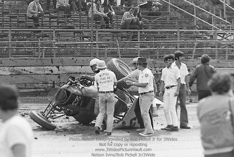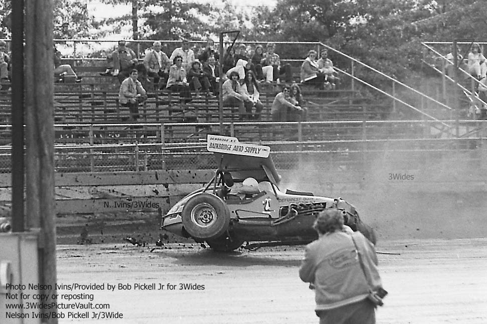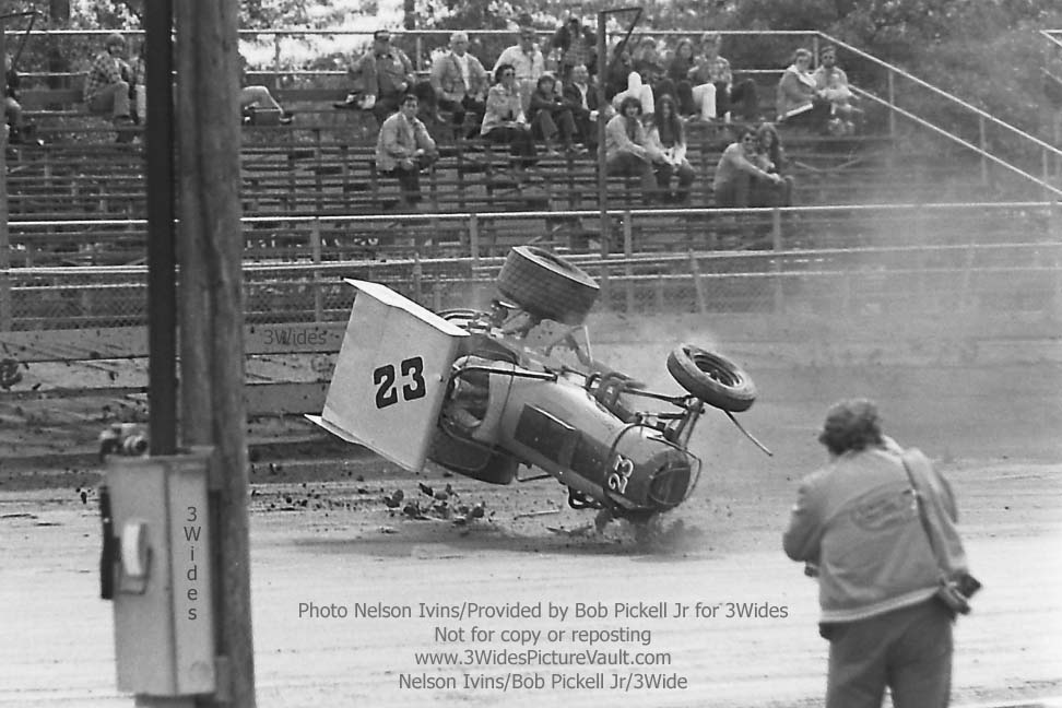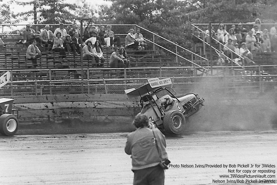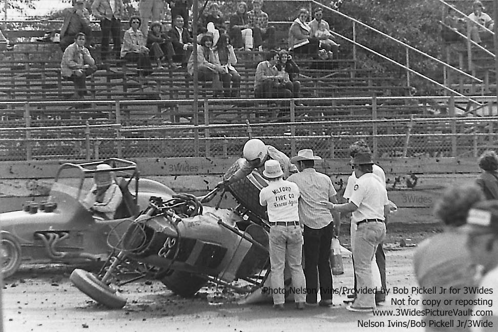 | Comments: | Comment: Looks like the #23 runs out of room on the high side of the #7 and takes a hard shot into the unforgiving wooden boards of Flemington, shearing off the right front wheel assembly, causing the car to dig in and roll over. Good to see the driver climbing out of the wreckage with the help of the Milford Fire Company Rescue Squad. |