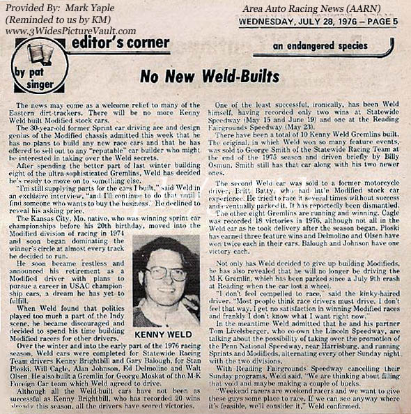 | 11.23.14 | 3Wide | I saw Phil in the stands a few years ago at New Egypt and asked him about the car and although it looked like a Weld car, it wasn't. I think he built it himself. |