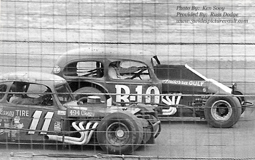 Answer: Walt Olson #R-10 and Jim Hoffman #11 during an All Star Race at Bridgeport Speedway (1973). During these All Star races, the asphalt racers would change tires and run side by side against the dirt cars... Then they'd meet again... at an asphalt track where the dirt guys would be the ones making the changes.