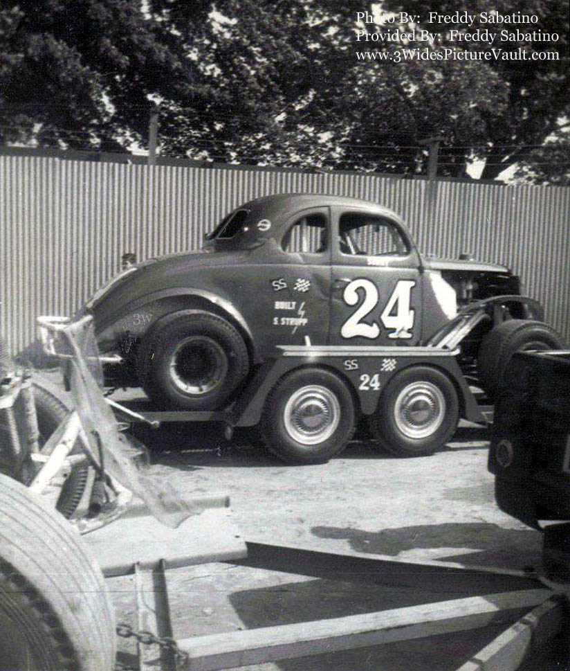 Sonny Strupp's #24 on the trailer entering the Nazareth 1/2 mile. This era, the early sixties, 1961-64 were the best years as far as I'm concerned with regard to the cars. To me they were still close to some form of stock visually, with the trimmed, full fenders and motors in a reasonably stock position in most cars. Sonny Strupp's cars were always really classic and he was one of the last to run a Y-Block Ford motor. The one I most remember was either before or after this coupe ... it was nearly a twin except that it was a flatback '37 sedan. Bright red with white trim and the sharp, classic #24 on the doors and trunk. Of course 1964 was a bad year for fatalities and it was the end of the era of classic full-fendered cars. By 1965 the more radically cut cars were pre-dominant with minimum fenders and motors moving further back ... bringing in the next evolution of cars. The mid-sixties-1970-71 era cars and stars were great but the early sixties were the best in my book. |