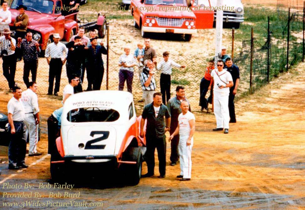 | Comments: | Comment: Frankie Schneider next to the #2 sedan. (Wonder what's happening on the frontstretch that's got everybody's attention?) Note videographer Dick Ivin's wearing all white in the background on the right. |