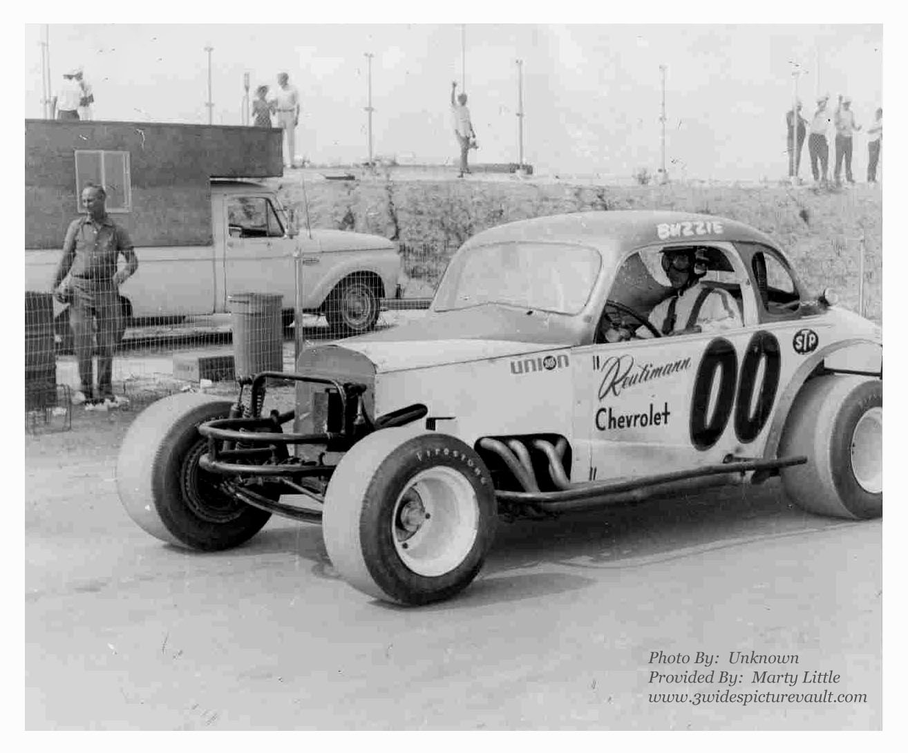 short track late models and some super speedway cars too. Buzzie Reutimann towed one of his gorgeous coupes down from NJ and is shown here ready to take to the track. In an effort to be aero efficient note full windshield, full hood sides and blocked off radiator area. From Marty Little collection and photographer unknown. |