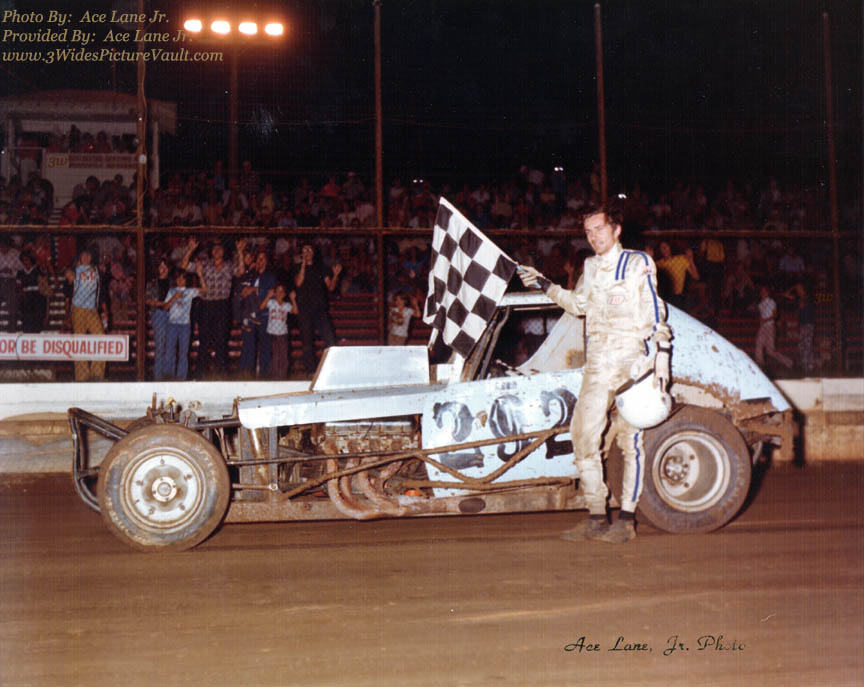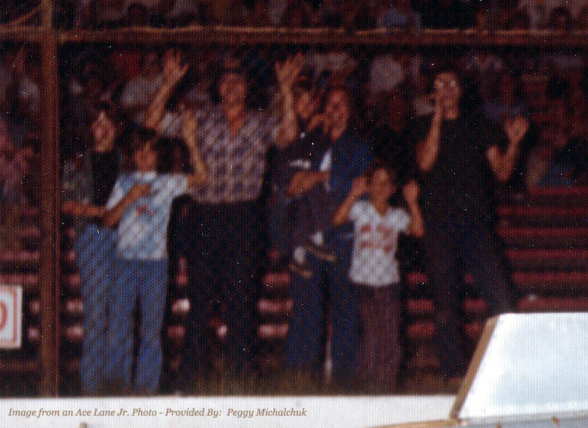 pretty much a home grown, leaf spring car. Here it is almost 35 years later and I notice celebrating the moment along the frontstretch fence in the background is Al's wife Peggy (in blue), possibly daughter Jennifer (white t-shirt) and son Alex (being held by Peggy)... And the guy with the plaid shirt and the "Cat Diesel Power" hat looks to me like a 15 year old future webmaster! |