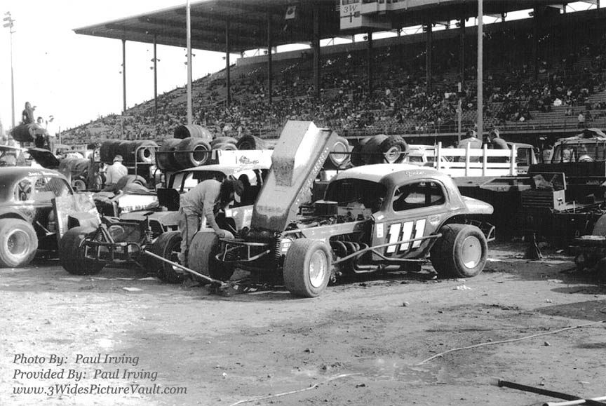 (Another great photo from Paul Irving) Here's a photo... of a driver who personified the "independent racer"... working by himself on his un-sponsored racecar... a heavy old floor jack supporting the frontend, a little box of tools containing just the necessities on the back of the truck... on what was once the world's biggest stage for short track racers... like "Goober." |