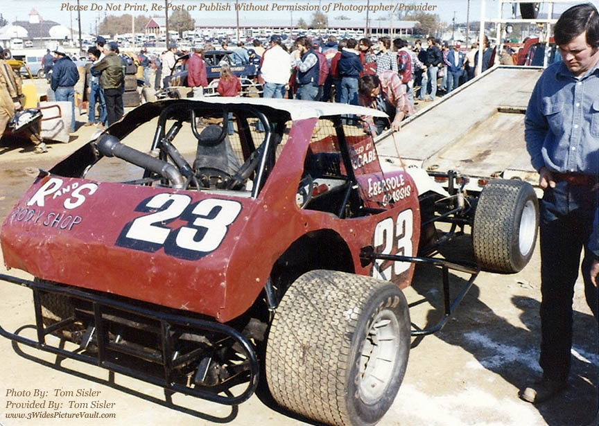 That's not Jerry next to it but it looks like it may very well be him in front of the car getting into the tool compartment of the hauler. This must have been late in the season. That thing looks like it went through some good battles judging by the straightness (or lack thereof) of the body. |