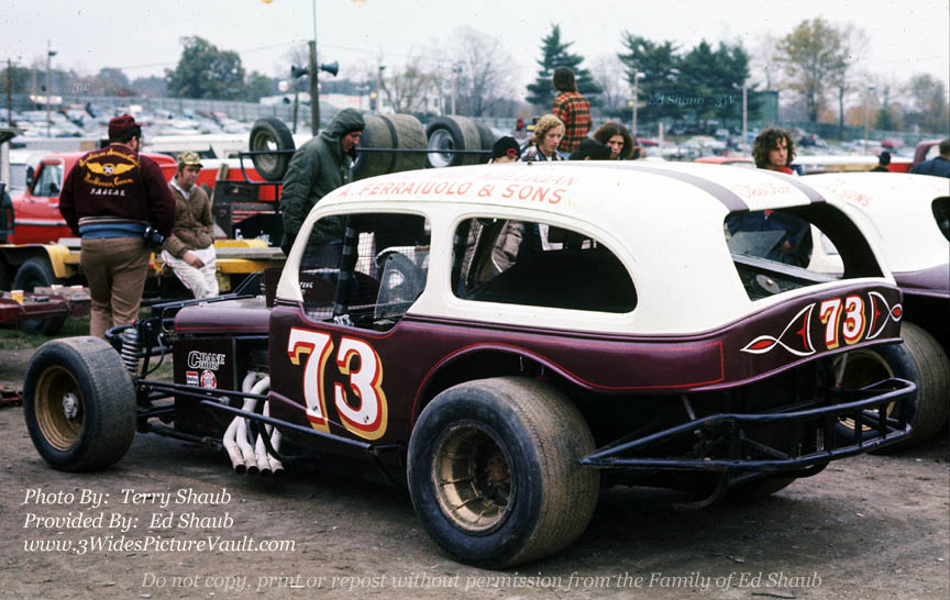 | Comments: | Comment: Great shot of the Ferraiuolo & Son's #73 sedan alongside the coupe on what looks like a very chilly day. I really like the angle of this shot and the look of the 4 exhaust pipes without a collector. This photo also shows what I think to be the true color of the car, along with the pin striping that follows the lines of the hood, all the way down the side of the car and around the back. And I'm pretty sure that's Whip, leaning back, looking at the car... the way a lot of racers do prior to the first race of the night. |