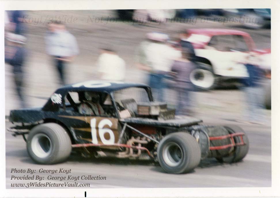 Jackie Wilson drove this car (chassis) in 1973. It had a '37 Chevy coupe body when Jackie drove it. That's the second Mustang body that Pete Jackson put on that chassis in this picture with Opperman at Syracuse in October ,1974. The first Mustang body was destroyed in a flip with Dick Hansen driving at Fonda Speedway in April of '74. |
