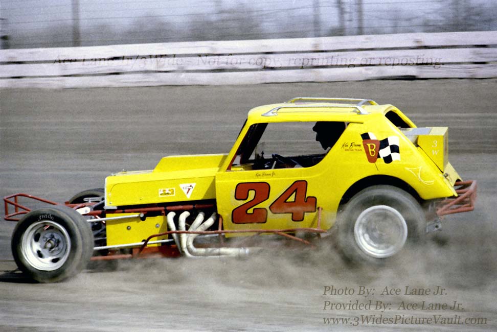| Comments: | Comment: I'm a little confused by this photo... It's definitely the Ken Brenn Sr owned #24 that was driven by Ken Brenn Jr, but I don't remember Kenny driving with that type of facemask. At first look, it looks like Stan behind the wheel, but I'm pretty sure that Stan's last ride in a Brenn owned #24 was in 1973. So... if you can help out and know who is driving the #24 above, email us and we'll add your comments below. |