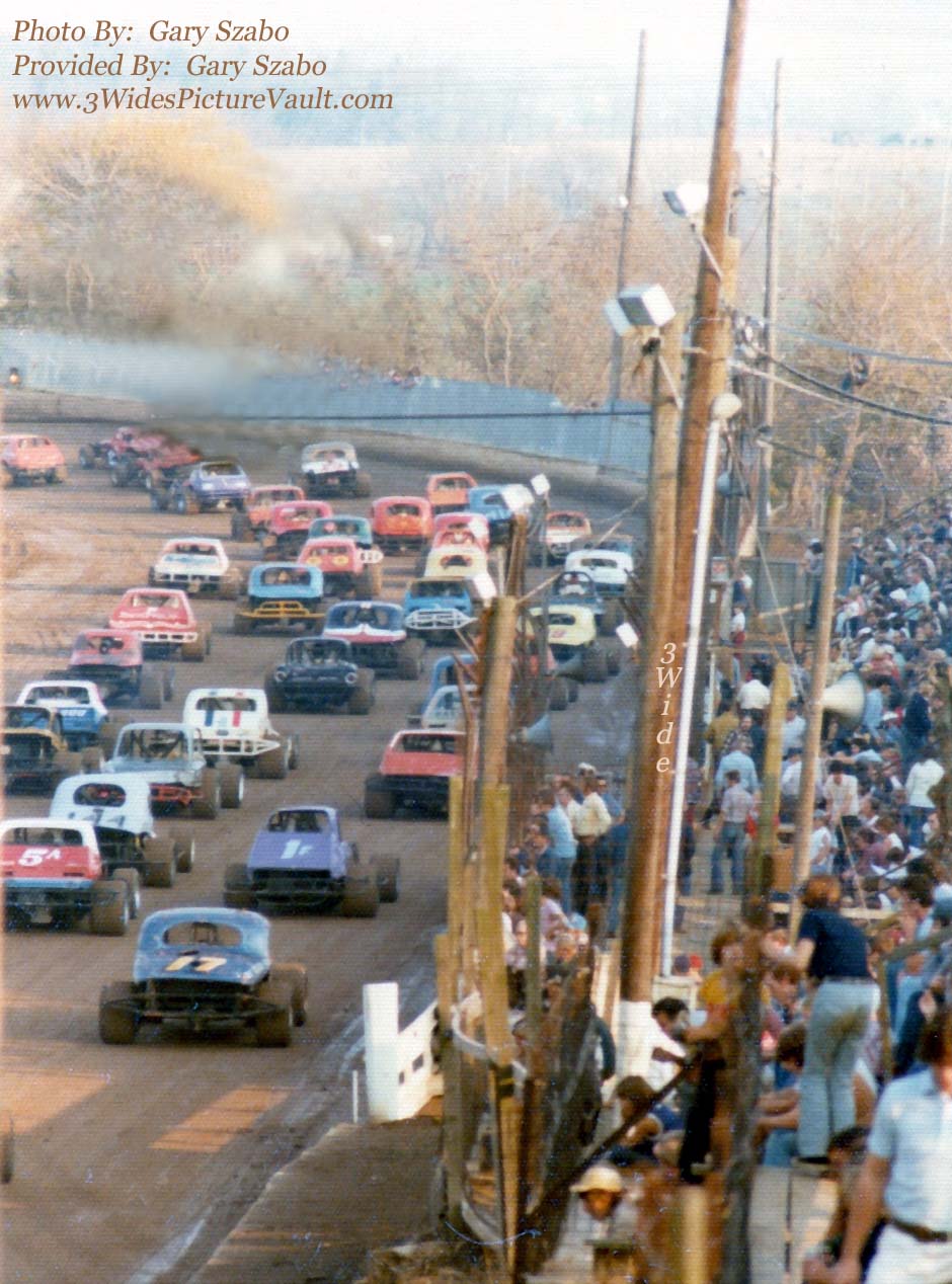 Visible in this shot are the Pickell 300. Looks like the Stan Hawk 17 starting in the back. That car was just at the P’burg Mall show this week. Chris Barger in the 5a. Stan Friedman 1f. Fran Hardner silver car red bumper. Bottcher 666 Pinto. Maybe Tanzosh sedan. Inzeo 80. Garrett 2a Vega. |