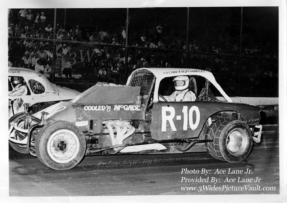 sudden just "there." What I mean was that it seemed like there were a few dominant drivers of the day... Ploski, Osmun, Beavers... and so many other guys would line up week after week... but the "core" guys still seemed to have things there way. And then Glenn showed up. I don't remember the date... and I'm not going to bother to look it up in a program as to when he started winning at Flemington and East Windsor... but I do know that he didn't spend very long "learning" how to get around either.... He was a force pretty much right from the start from what I remember.... Glenn also had a few bumps along the way as can be witnessed by the car above.... this one looks like it has a nosepiece on it from a Mustang bodied #R10... and the roof looks kinda like the roof from when the #'s on the door were lettered properly with the traditional "R10".... But back in the day when it was EWS on Friday... Flemington on Saturday.... and back to EWS on Sunday..., sometimes they didn't have time to make them pretty. |