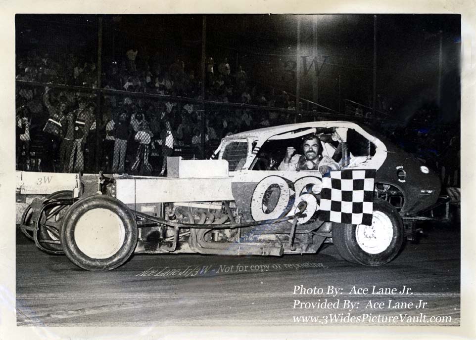 matched with his pre-race/post-race excitement. During his first lap around the track, Joe would hold the clinched fist to the sky as a salute to his many fans who would always respond with the same clinched fist salute. It was a way of Joe saying, "Are you with me?"... and the crowd responding with, "We're riding with you on this one Joe!" As seen in the photo above, Joe's excitement continued right on through to victory lane, with a victory fist, and a big "Joe Hall" smile. |