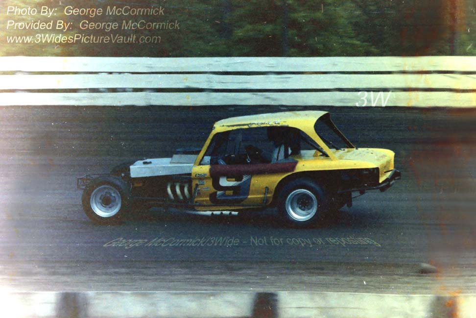scrap. Howie had a good home for it! It was just a shell without front fenders which made it perfect for the beginnings of a stock car body. Howie cut and skinned the rest of the car with a torch. The roof was cut in a big square and all the window posts were made by Howie from flat sheet metal. Somewhere around the time this car was being built (1969) a friend of Howie's named Jimmy DeBaro started helping out. He had a lot of knowledge when it came to body work. Howie and Jim used 3/8" steel fuel line from the parts store to make a bead around the body edges, along with a little welding and some bondo. They used 5/16"or 1/4" around all the window/roof posts to stiffen it up. The roof was moved back on the body to make it sit right and look cool from the side! When it was ready for paint, the car was taken to George Unfried's in Ringoes where Jimmy DeBaro worked part time doing body work. It was painted yellow, and was run that way for the first year. At some point, a color change was in order, so it was later painted black with silver sides, but kept the "#9C.". The car was raced beginning in 1971 (yellow), and after the color change, continued to race through the 1974 season. The Falcon was eventually replaced with the black Mustang bodied racer. The rear and a few other parts from the Falcon were used on the Mustang, and whatever was left of the Falcon (mainly just the chassis, body, and front axle) was sold off. |