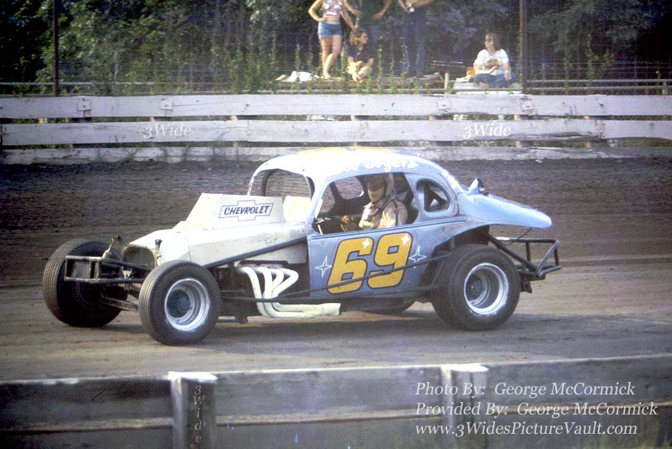| Comments: | Comment: Bob Ayres with a big block under the hood of his #69 coupe. If I remember correctly, Bob wanted to go racing so he either sold or traded his motorcycle so that he could by the above coupe from Dean Applegate who ran it as the same color #9a. Bob ran the car in sportsman and became a steady runner, and then went modified racing in what I think is the same car. |