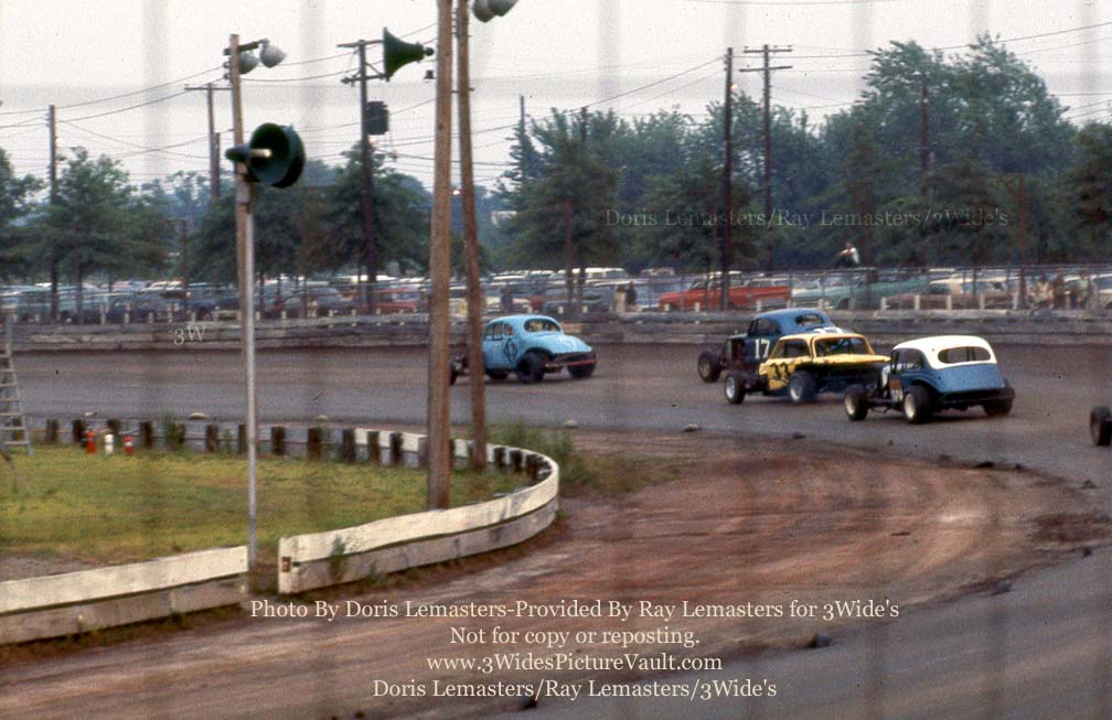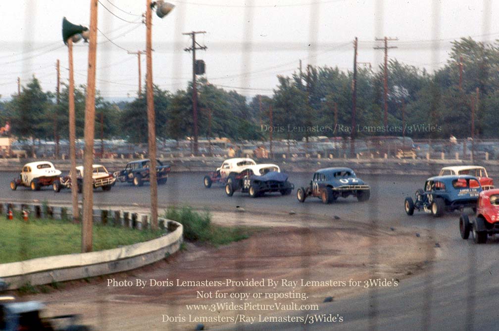 Urban #76A. Some of the modified drivers in the bottom photo include Sammy Beavers in the #43 and Jules or Geza Sestek. Not sure who is riding the wall or who is in the #317 up front. |