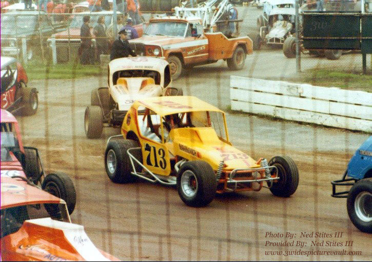 a real looker! Speaking of looking... if you look close enough you might also see the tail end of the A car, the orange #8T of Bob Turlip, the #76 of Chamberlain, the #SSS of Alan Kessler, the #37J of possibly Ron Harrison?, Ray Kozimore?, the #81 of Sammy Beavers waiting in the pits with Chip Slocum in the #CL22 just behind. |