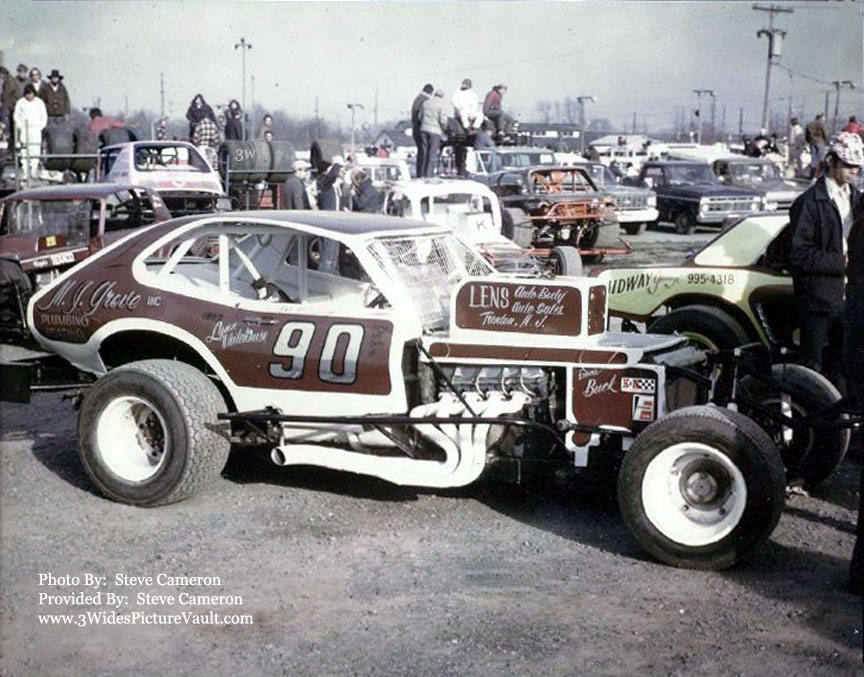 | Comments: | Al Whitehouse Ford big block power under the hood of the Lynn Whitehouse owned, Bob McCollough driven #90 Pinto bodied Modified. Fran Callery in the #3D Mustang along side, with Kerry Schoder's #K46 white coupe in the background, and Jack Voorhees brown #33 Falcon still on the trailer. Might be Mike Jablonski's Gremlin still on the trailer directly behind the #90 too... Just another Saturday afternoon in the pits at Flemington in the mid 70's... |