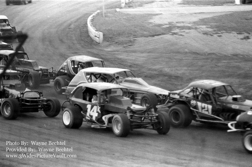 | Comments: | Ron Harrison in this "unique" looking #14k with a group of powerful modifieds negotiating the 1st turn of Flemington. Others include Mike Grbac in the #121, Stan Ploski #27, Ken Johnson #64 and Craig McCaughey in the #301. |