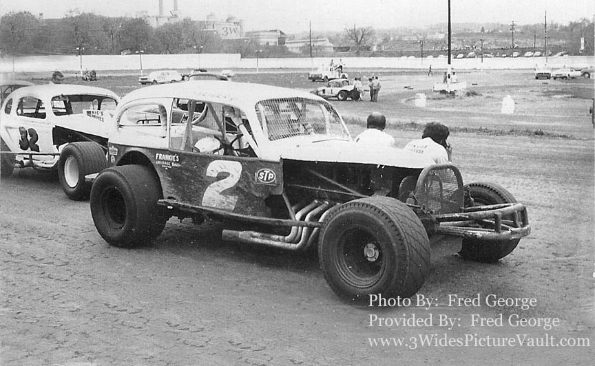 | Comments: | Great photo of Frankie's #2 on the homestretch at Nazareth. Not sure if that is Frankie sitting on the other side of the car, and it may be another driver with possibly an "All Star" racing T-Shirt next to him. That's Danny Mitchell's #1 parked in the infield with a former Buzzie Reutimann coupe |