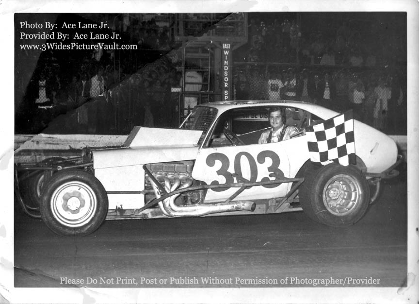 the roof... and the driver's name written over the side windows... Here's Fred in one his Pinto bodied modified. The car has a nice, smooth... "all business" look to it. And we all enjoyed watching Fred in his #303. Fred did well at other tracks, but I think East Windsor was always "home". The photo was a little damaged, so its hard to see, but I wonder how many of you might have been standing on the other side of the chain link fence? |