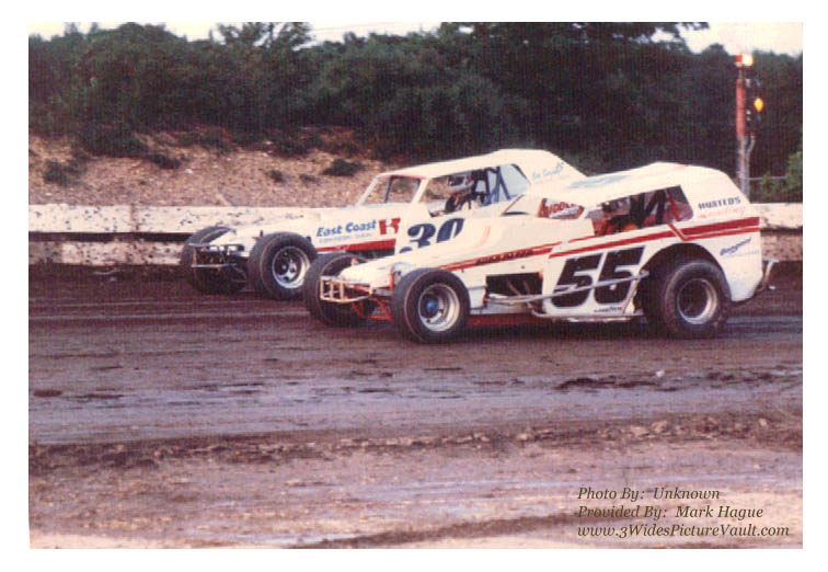 Comments from Mark: (Top photo) YES HE IS LEADING DOUG HOFFMAN !!! TWO GREAT RACERS GOING AT IT !! NICE OLSEN CARS. PIC TAKEN BY MARK HAGUE (Center photo) STEW WAS UP FRONT EVERY WEEK. HE WAS A FAN FAVORITE AT BRIGEPORT !! HERE HE IS IN HIS BUDD OLSEN CAR. (Bottom photo) A FRIEND TOOK THIS ONE AT EAST WINDSOR I THINK. STEW WAS A REAL COMPETITOR AND BRIDGEPORT AND EAST WINDSOR. ALSO QUALIFIED FOR SYRACUSE SPORTSMAN RACE IN WHICH HE GOT HARD CHARGER AWARD. |