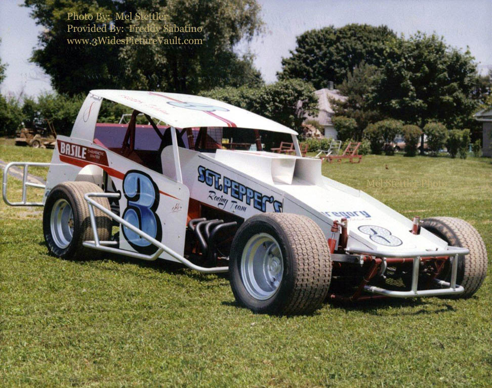 became rare. As the knowledge spread of the importance of downforce, the fabricators tossed the "real bodies" and came up with wedge shaped creations that also relied on inner panels to help with the cars handling. Eventually by the late 80's, wider bodies became the thing as teams realized the wider they went, the more air they could control.... To me, the car above represents that time period between "real factory bodies" and the "wide" bodies. It was a time that those that had the skills and who could take the time, could still show some ingenuity and to me, the cars still had a real "coolness" about them. This really sharp looking early 80's modified driven by Freddy Sabatino at the Nazareth 1 1/2 mile track in 1982 is a good example of that period in time.... Cool ride! |