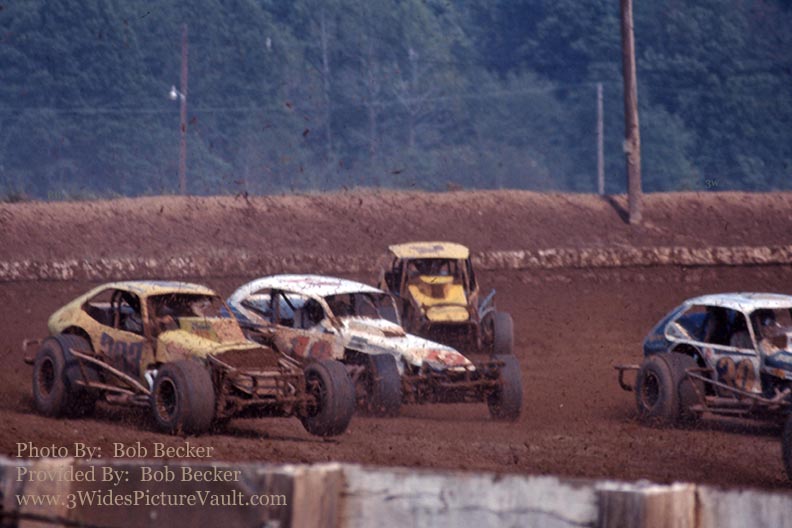 | Comments: | Comment from Bob: Joe, here's another I shot on 9/21/80. As the clay flies coming of the second turn, Fred Dmuchowski is on the outside in his 303 with Kenny Brightbill in his #19 Pinto Chic Cossabone in the yellow #7a and Frank Cozze in the Blue Hen Racing #30 on the inside. |