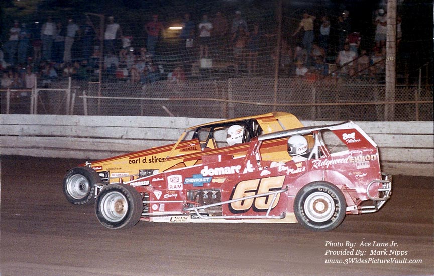 | Comments: | Other than for couple hundred feet on the center of the backstretch, this is pretty much the way cars went drove all the way around Flemington. Here Don Menzel in the Stires #1X is on the high side of Stan Ploski in the #65 which was fielded by Andy Roscoe. |