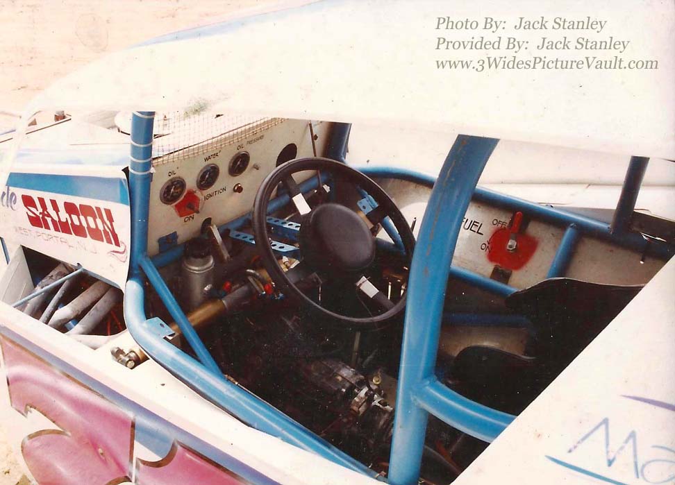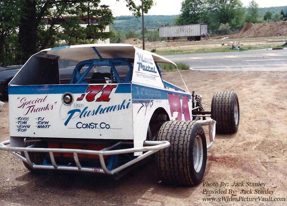 Comments From Jack: Top photo: This is my 1990 rookie car at Flemington. It is a Brightbill Kreitz chassis car that I bought from Russ Thatcher. I've still got it too. I believe Russ told me its a 1979, and that he bought it from his brother in-law Mark Plummer. Bottom photo: Opening day - notice anything about cockpit? No clutch,,, It was a two speed powerglide with a hand operated hydraulic valve instead of a torque converter. you fed the throttle, and instead of operating a hand clutch, you opened a valve to allow trans fluid to start circulating. You gradually opened the valve just the same as feathering a clutch, and when you stopped, you had to throw that valve shut or you could stall. Tthen as you got up to speed, you clicked a tiny lever to shift into second. There was also a lever to help get you moving without stalling out, but I never used it - luckily I had enough ambidextrous coordination to get the rolling onto the track and into gear - we always joked that it was like playing one of those old one man band instruments. |