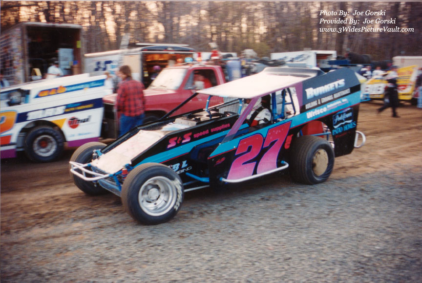 | Comments: | Another great photo from Joe - Here's the Bob Burkett #27KC that we remember having a few different drivers. I'm thinking that this might be current URC driver Joe Zuzeck behind the wheel, but I'm not 100% sure on that... Other driver's of the #27KC in later years were, Wade Hendrickson, Chip Slocum, Mark Bitner, and others. (That's Mike Sena in the #22 getting pushed out in front of the #27KC and Freddy Dmuchowski over in his pit stall. |
