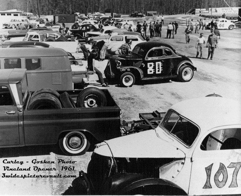 | 09.06.12 | Larry Jendras Jr. | I love those wide angle shots. You can find so much detail. Such as 1960 & 1961 NASCAR Modified Champ Johnny Roberts in Tiny Slayton’s flaming #7 coach next to the #80 coupe. It is being pulled by a Ford pickup with matching paint job. I think this was the Vineland opener that Roberts would win. |