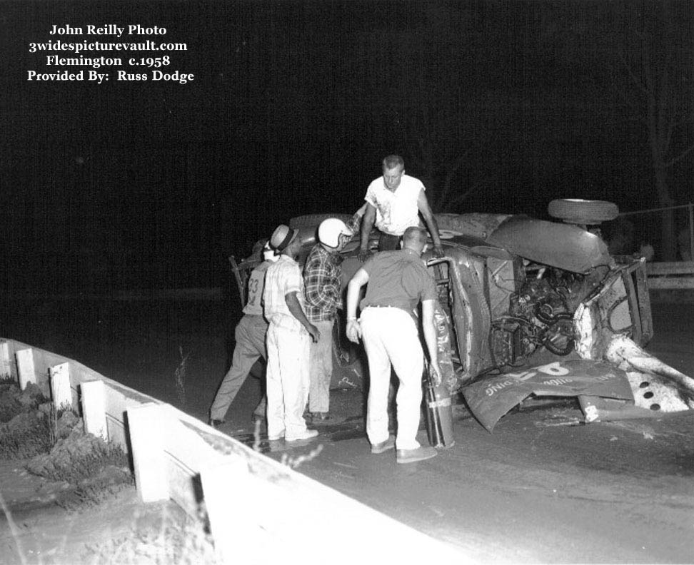 | Comments: | Another very interesting photo from Russ... Looks like a couple of drivers and maybe Ace Lane Sr coming to the aid of the driver who is climbing out of the mangled racer. |