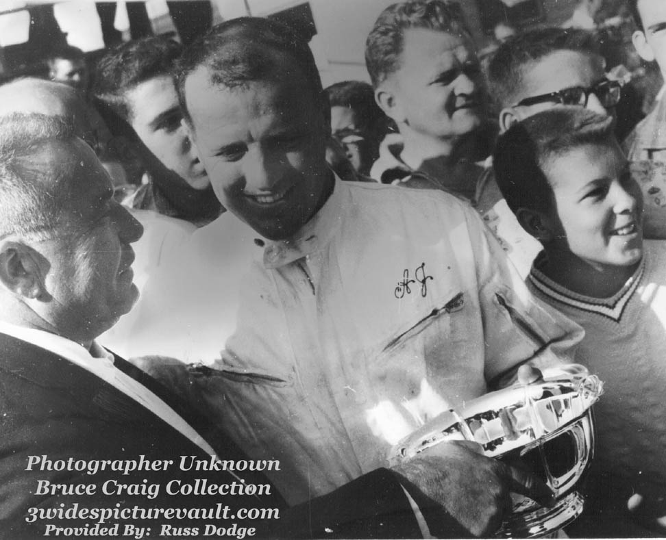 Comments: | Comment from Russ: Joie Chitwood presents A.J. Foyt with the winner's silver bowl at Reading in 1962. Joie Jr. is on the right. |