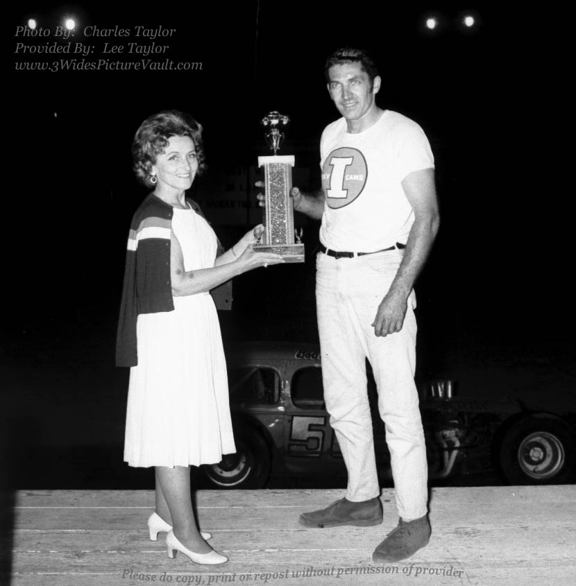 Comments: | Driver and master car builder Bob Rossell, wearing his ISKY Cams shirt, accepts an award from Track Owner Jenny Nichol. |