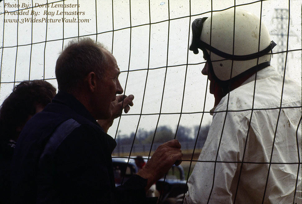| Comments: | Comment from Ray Lemasters: This was taken in May 1970 at Nazareth. Paul "Sandy" Rochelle, right, is chatting with Lloyd Henderson of Hackettstown, NJ. Lloyd operated Henderson's American and was a supporter of Sandy's. Sandy did some of the work on his cars there where he built a home made 2 x 4 frame that was used under one of the Kozimor 37-J coupes. Story from John Kozimor goes that Flemington wouldn't pass it so John or Sandy cut the part number out of a wrecked Chevy frame, welded it to the home-made and got it through inspection as a "modified" Chevy frame. Sandy also experimented with quarter eliptic front springs on that frame. I saw him fitting those springs up at Lloyd's station. |