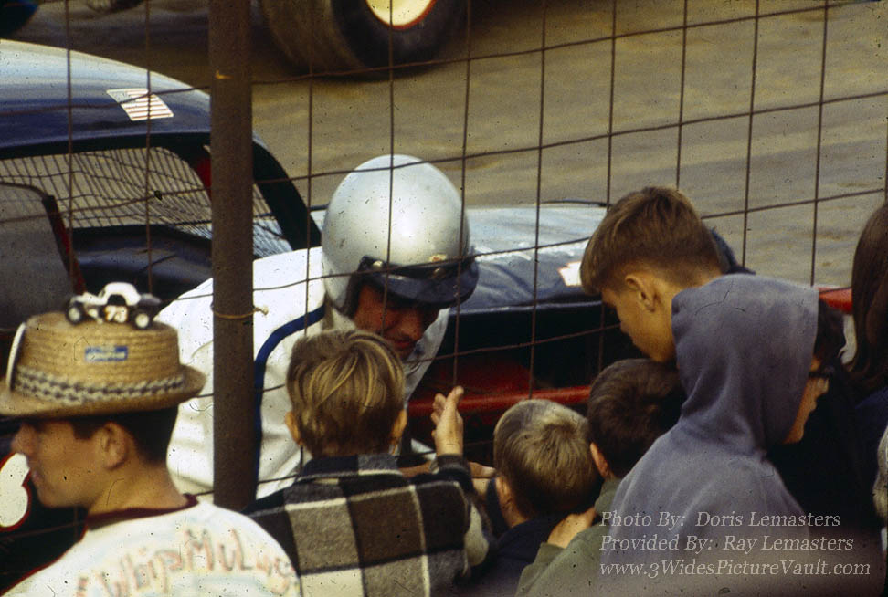 Comments: | Great frontstretch photo from the lens of Doris Lemasters of fan favorite Charlie Shire saying hello to some young fans. Charlie was a top runner and had a bunch of fans, but something tells me the fellow on the right might'a been a Whip Mulligan fan! |