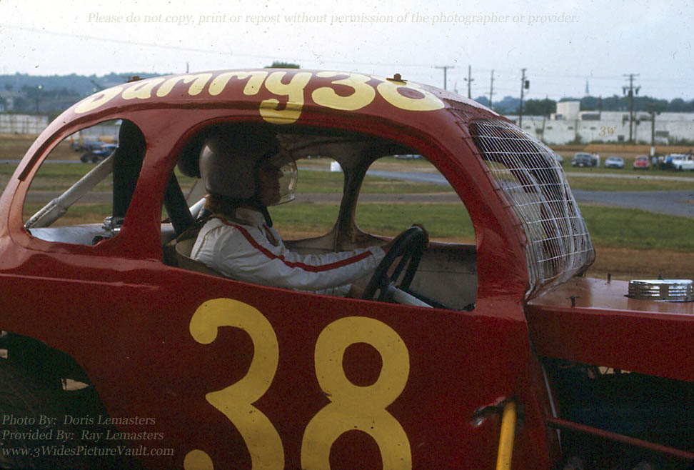 Need some information on Sammy in the #38. I was just thinking about how over my almost 50 years of going to the local short tracks, I've seen quite a variety of helmets and face protection. During my first few years at East Windsor I saw a few 1/2 helmets (Pee Wee Griffin comes to mind), a bunch of 3/4 helmets with a pair of goggles and a bandana, or with either a face shield or a bubble shield (like above). Some wore the 3/4 helmet with the pointy nose mask and goggles... and then eventually by the mid 70's, most guys were wearing full face helmets. Of course in the past few decades, better "lighter" helmets were developed and now most have a fresh air system plumbed in too. While we're on the subject, it wasn't until a few years later that gloves with fire protection became mandatory too. |