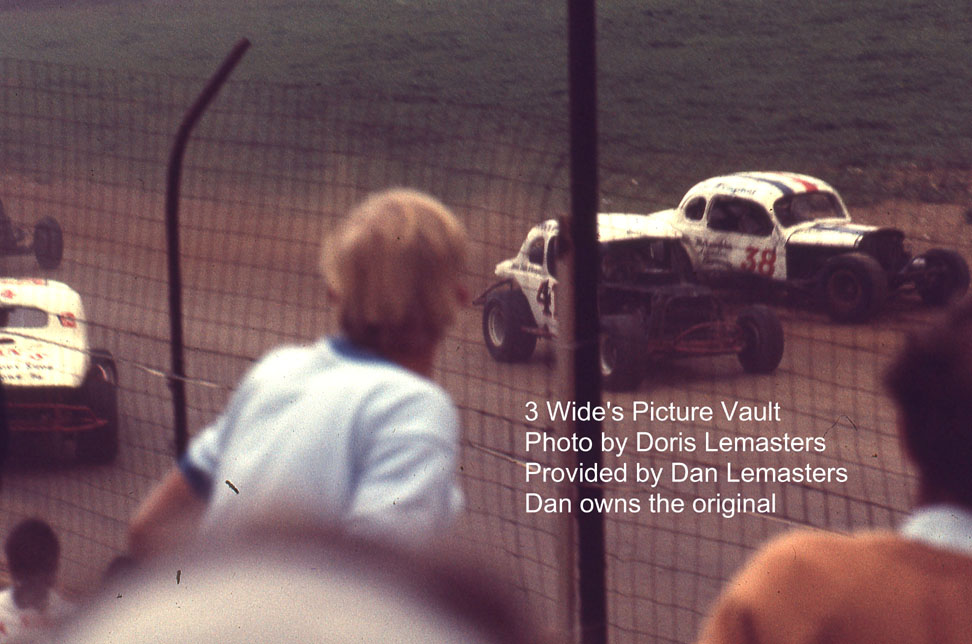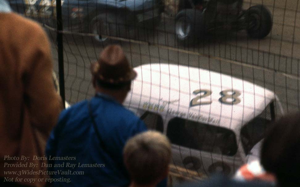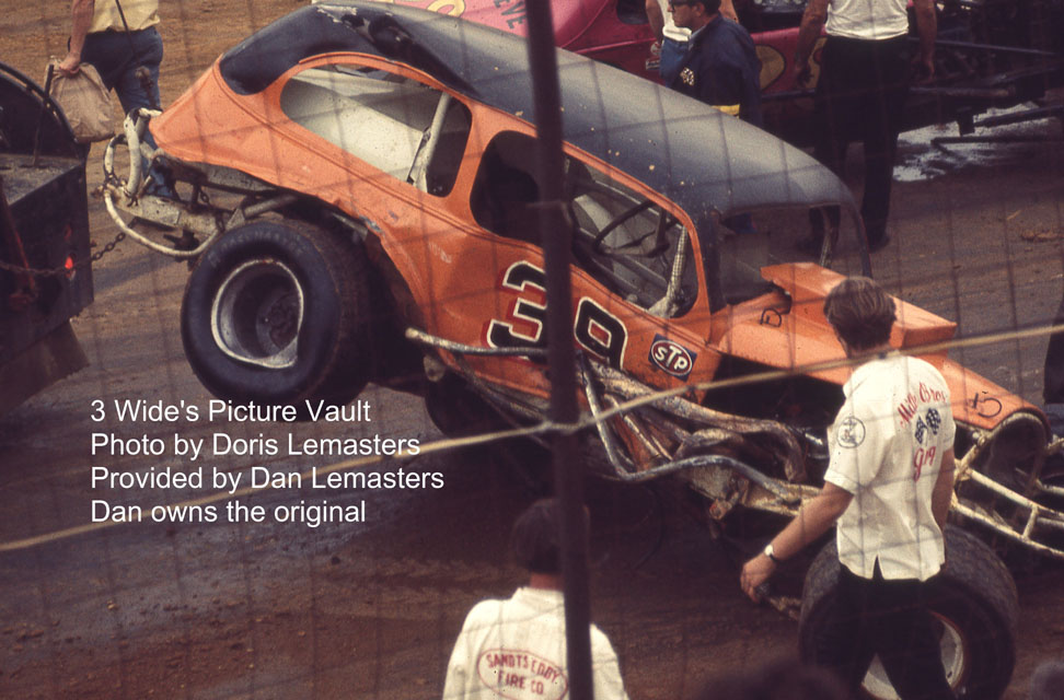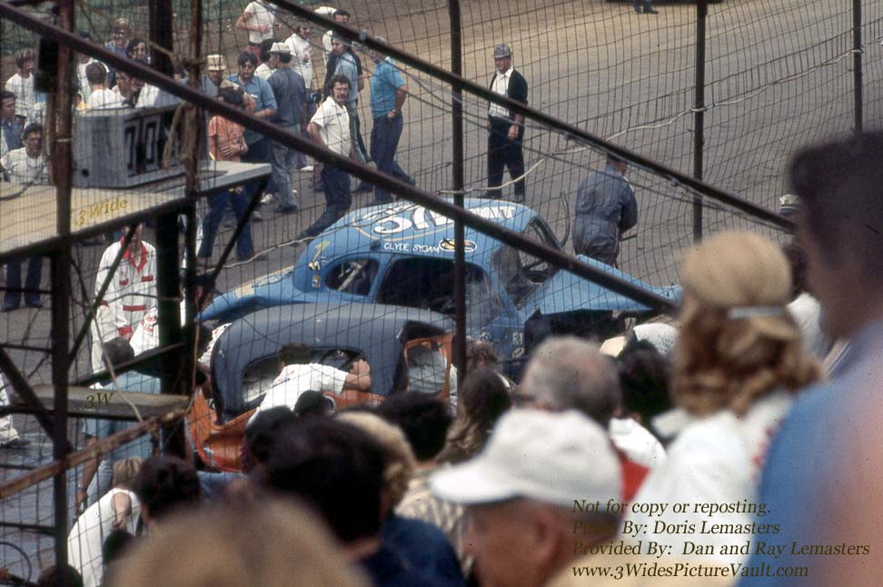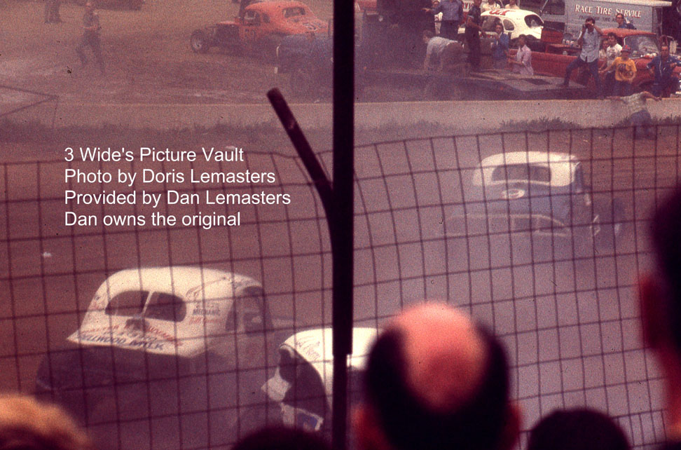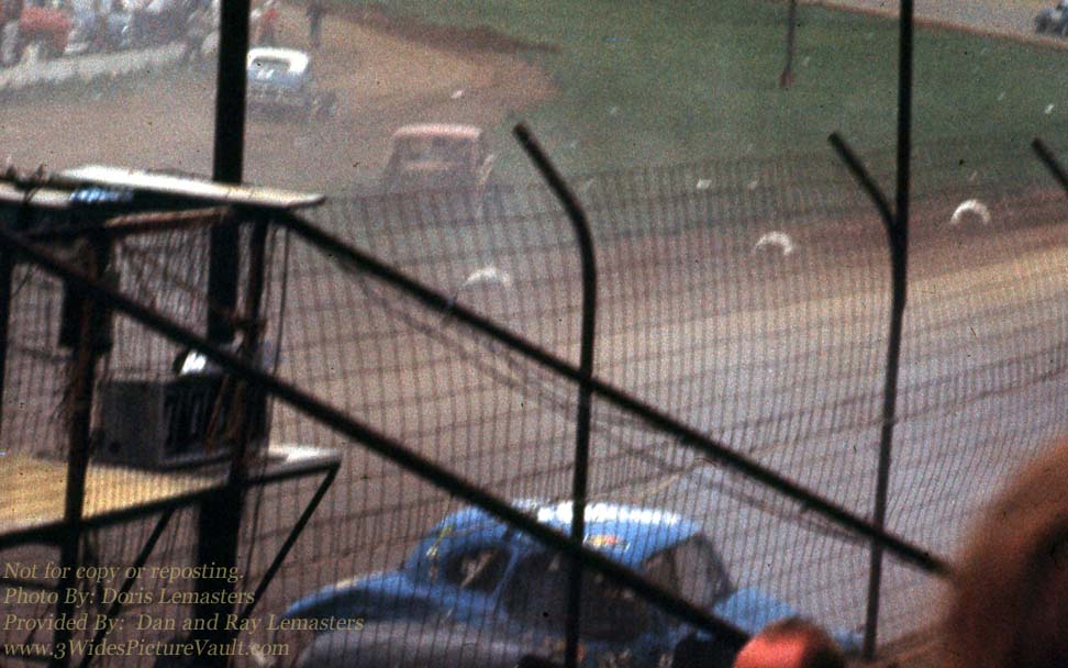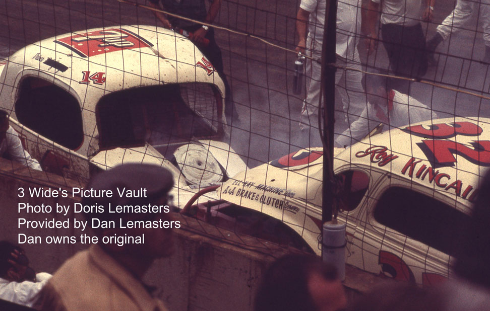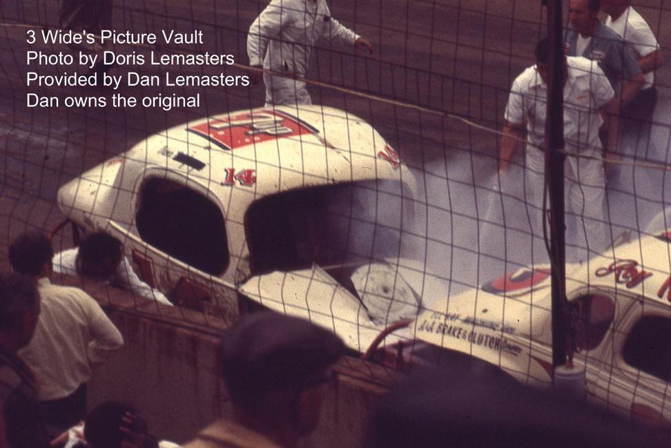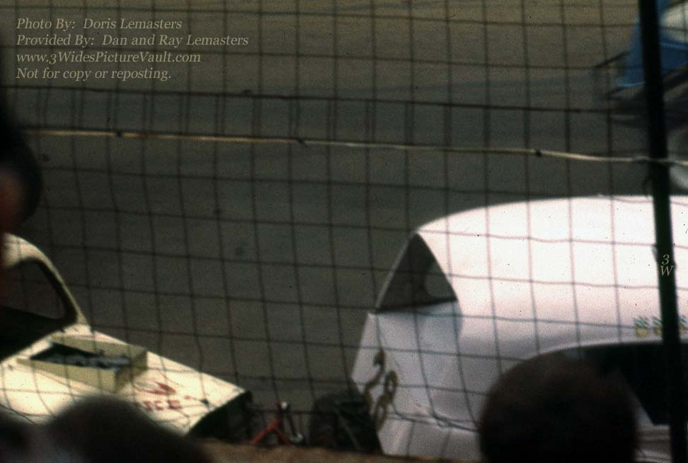 | Comments: | Big frontstretch crash captured in photo by Doris Lemasters involving at least 7 cars. The photos capture what it is like when one second you're sitting in the stands watching cars racing by, and the next second chaos breaks out with the frightening sounds and sights as cars crash and grind into each other. As you can see, there's a small fire under the hood of the #14. The track crew rushes over to the badly damaged #39 to try to provide aid to driver George Ameman as a driver (possibly Clyde Suydam - driver of the #37V) sits on the wall with his helmet still on, catching his breath from what had just happened. In the bottom picture, the driver of the #28N hold his head, as he tries to figure out what just happened as bumpers and leaf springs are scattered across the track. Not sure but it looks like kinda like Bob Pickell walking by in street clothes and sandals walking the #28N in the bottom picture. |