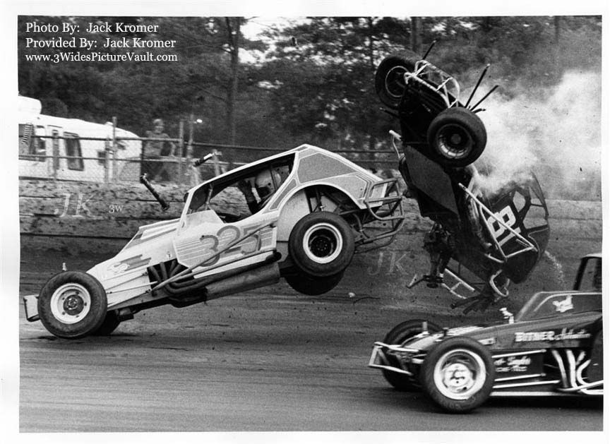 Comments: | Elvin Felty takes a wicked ride in the Norcia #81 as Phil Hare in the #325 get's some air as well (hand off steering wheel). Notice the fuel pouring out the back of the #81 and also that the rear has been totally ripped out of the car and can still be seen dangling on the other side of the car. That's the Trenton Mack King #74 trying to find a way by on the inside. |
