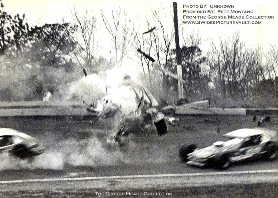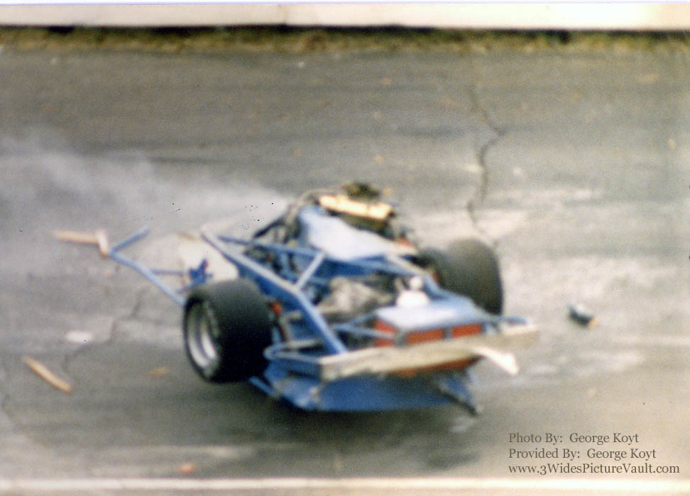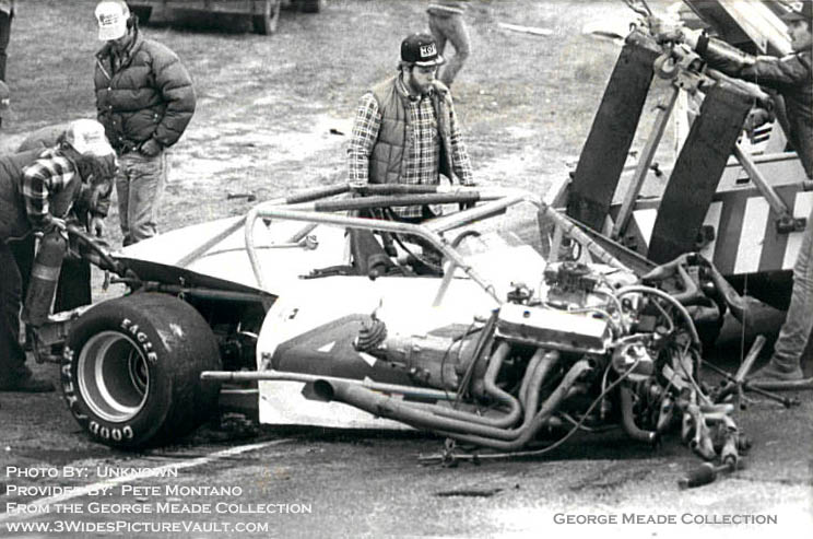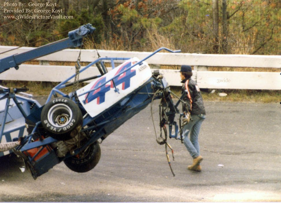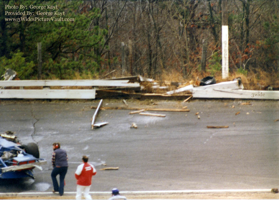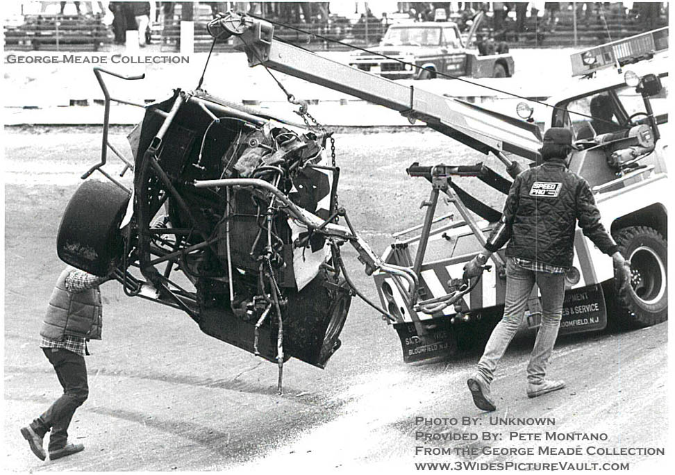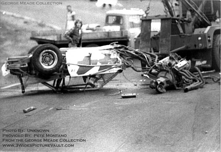 of the worse crashes in the history of Wall Stadium. The crash occurred as the car headed down the backstretch, just before the entry point of turn 3. The car was turned to the outside (to the right) as it entered turn the corner and instead of bouncing off the fence, it punched through the wooden fence, causing the car to split apart, ripping everything away, from the firewall forward (including the engine which can be seen in the upper right of the top photo.) From what I hear, Vinnie received a sprained toe... and returned to race again! |