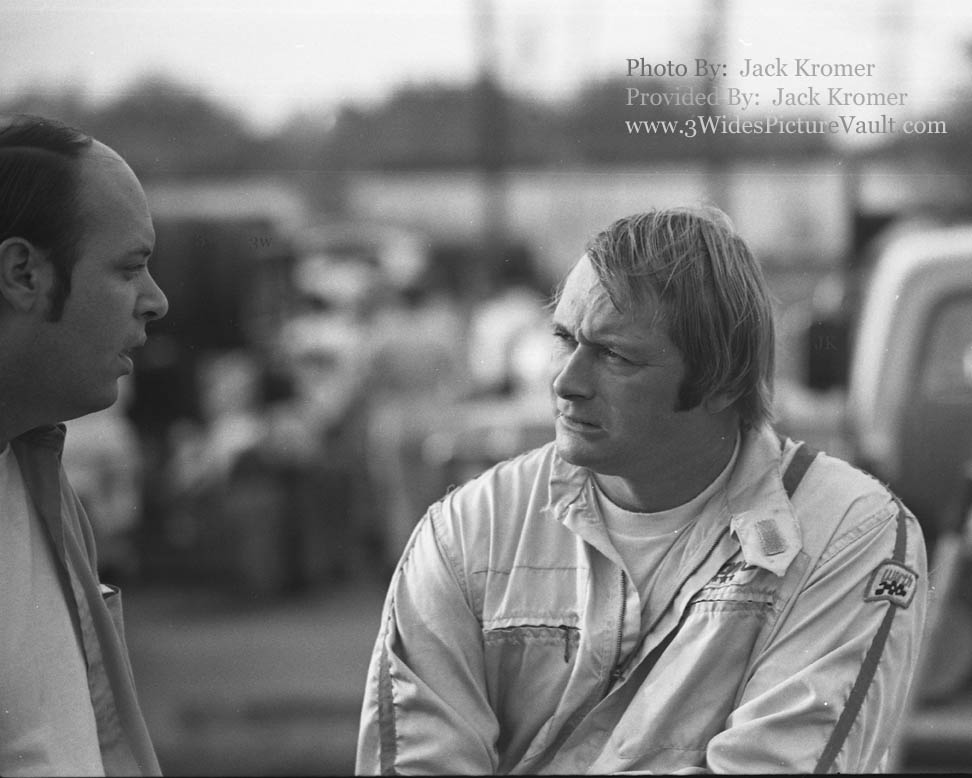 | Comments: | Car/Engine Builder John Burnett talks with one of the best, Sammy Beeeeeeevers! Great shot from photographer Jack Kromer as he really captures the moment. Feels like it was last week.... Sammy was probably in the Norcia #81... His driving uniform is probably the gold'ish color... The sounds of engines probably fills the pits as cars make their way through... Great photo. |