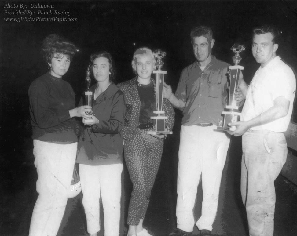 | Comments: | Comment: I'm going to need your help with this one guys. We have identified Anna Mae Pauch in the middle and that is racer Jimmy Hash who drove the white #98 sedan on the right, but not sure about the others in this photo and hope you can help out, along with the location - Thanks. |
