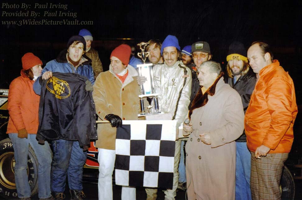 Comment: Howie Cronce in victory lane with flagger Ken Golden