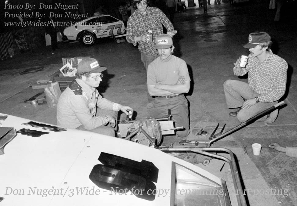 | Comments: | Comment: Rare picture provided by Don Nugent of Kenny Weld and crew taking a donut break next to the #91 asphalt modified that Kenny drove briefly. From the expression on of the team, it looks like there was still some work to be done on the #91. |