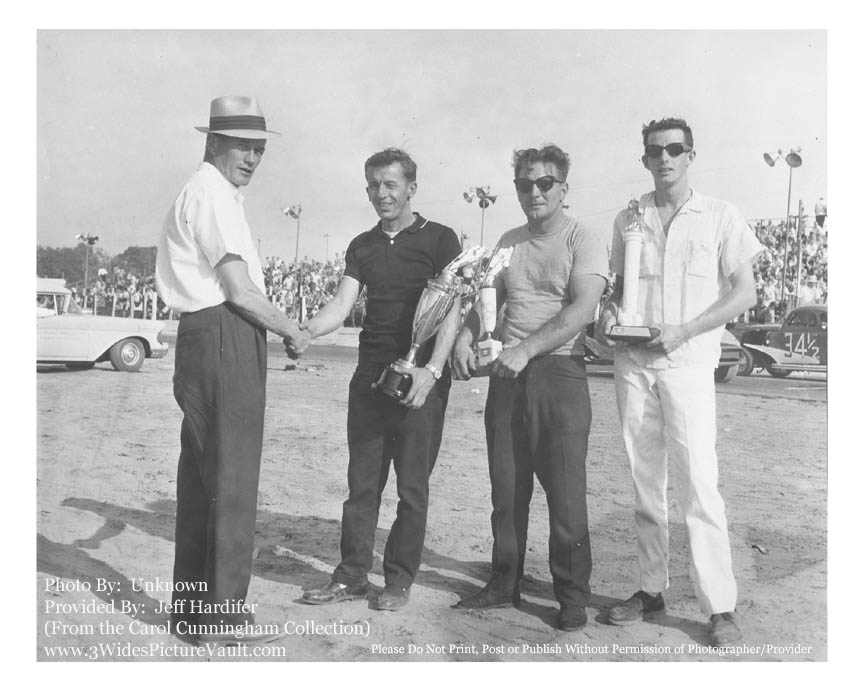 | Comments: | Comment from Jeff: The 1961 Old Bridge Trophy presentation. Pepper Cunningham presenting the hardware to modified champ Ed Flemke, sportsman champ Jack Hart & novice champ Stan Van Brunt. Ed Flemke Jr has told me that he still has his father's trophy. |