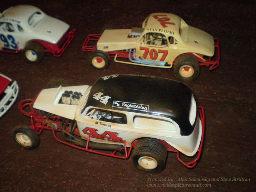 I wanted to do a diorama that was representative of a typical field that might have raced at East Windsor in 1969 or early 1970. It is important to have a field not only of top 'All-Star' names, but one that represents the 'little guy' as well. I went through archives of 1969-1970 Area Auto Racing newspapers and pictorials to joggle my memory as to who ran East Windsor and what was the car used at that point in time. Using our memories, pictures from my photo collection, those on the 3_Wide web site and if we still couldn't find a picture - from the Russ Dodge collection (thanks to Russ who so often came through within hours), enabled Stew to recreate these cars as accurately as possible. We did not stop there. We actually contacted former drivers as well. The late Len Martin, Phil Gememdan, and Ray Neary were very helpful and informative. Researching the individual car is a large part of the work and fun it takes to model it. Reminiscing with driver Len Martin on his May 1970 victory over Stan Ploski was certainly a high-point. Discussing the 33 degree rear suspension set-up with Ray Neary on the Munschner #21 was another.