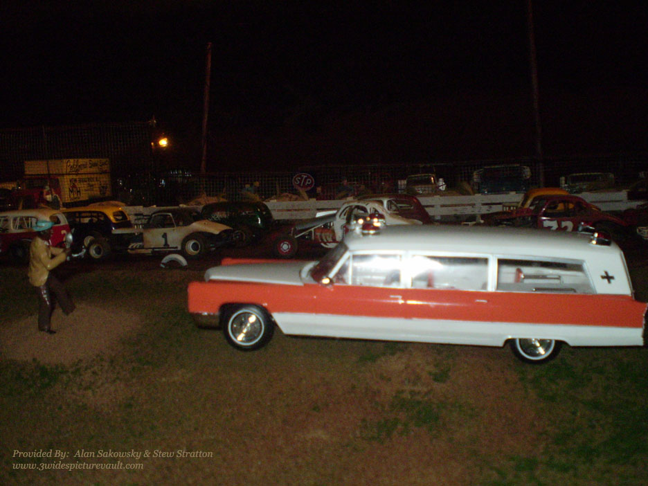 While the cars are the stars here, there is so many other activities going on. The field is paced by an old WW-II converted jeep. This was the official pace car used by the speedway among many other jobs. The infield has track photographer Ace Lane Sr. snapping a shot as the cars are lining up. Finally, an old 1960's Cadillac ambulance from the East Windsor rescue squad is moving into position inside the infield ready if is should be needed. The California Speed Shop tire truck often present in the pits selling its M&H tires and D&A oil products is included. The truck advertising side panels are all hand-painted by Stew.