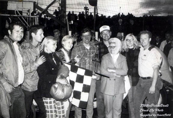 Bob Burkett (left) in victory lane with Stan Ploski in this 1969 Chuck Ely photo (provided by Mark Yaple/Ron Blake.).