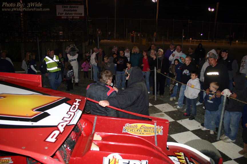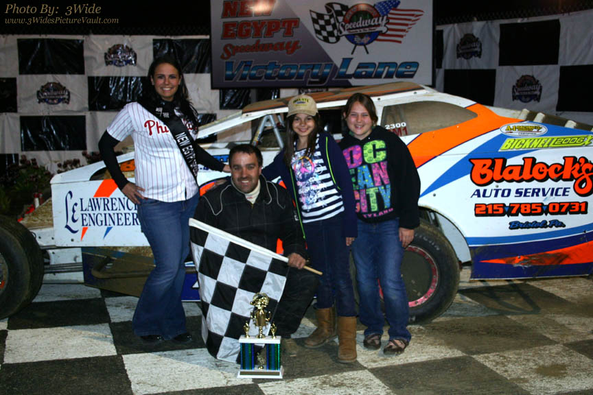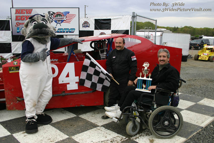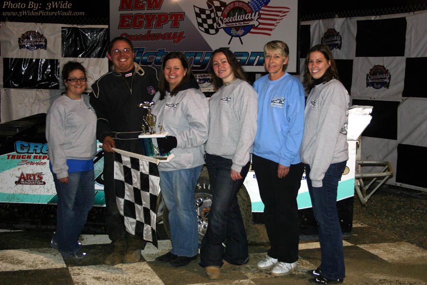 Here's Pat in Victory Lane with representatives of event Sponsor "Infante's Sod Farm" (Allentown, NJ) after winning the Crate Sportsman Feature event.